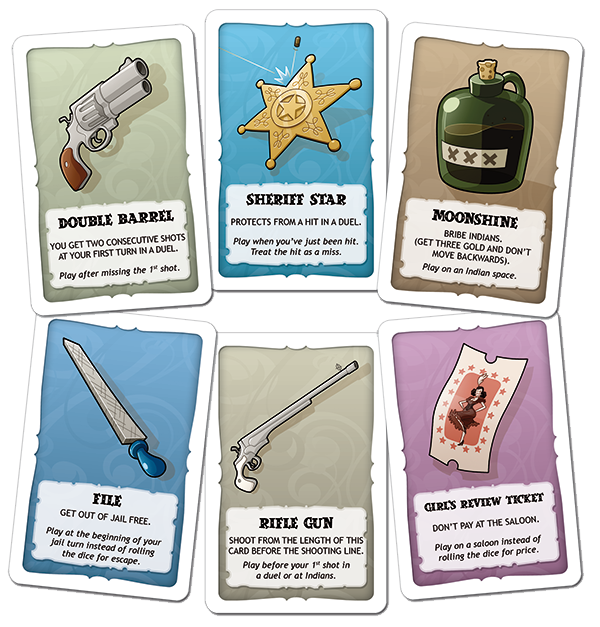 Pony Express uses a simple poker dice system combined with bluff and bluff calling to resolve the moves of the players all the along their way on the board. Combined with the fact that dice are also used as bullets to shoot the other players pawns during duels or other gunfights, you get an idea of the unique ambiance around the table during a Pony Express game session!